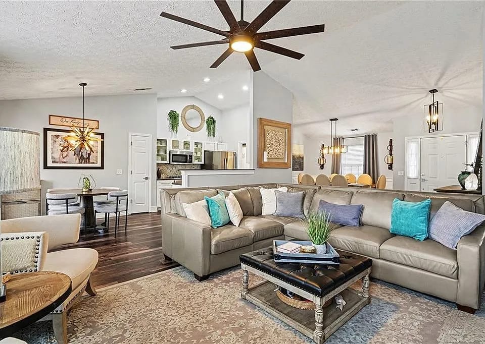 π Dramatic Architecture: Features soaring two-story vaulted ceilings and a stunning open staircase.