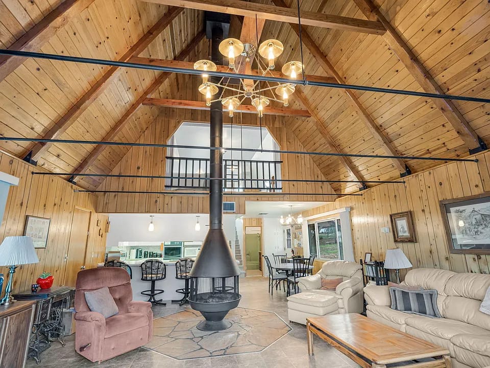 🔥 Cathedral ceilings, rustic trim accents, and a wood-burning stove in the walk-out basement