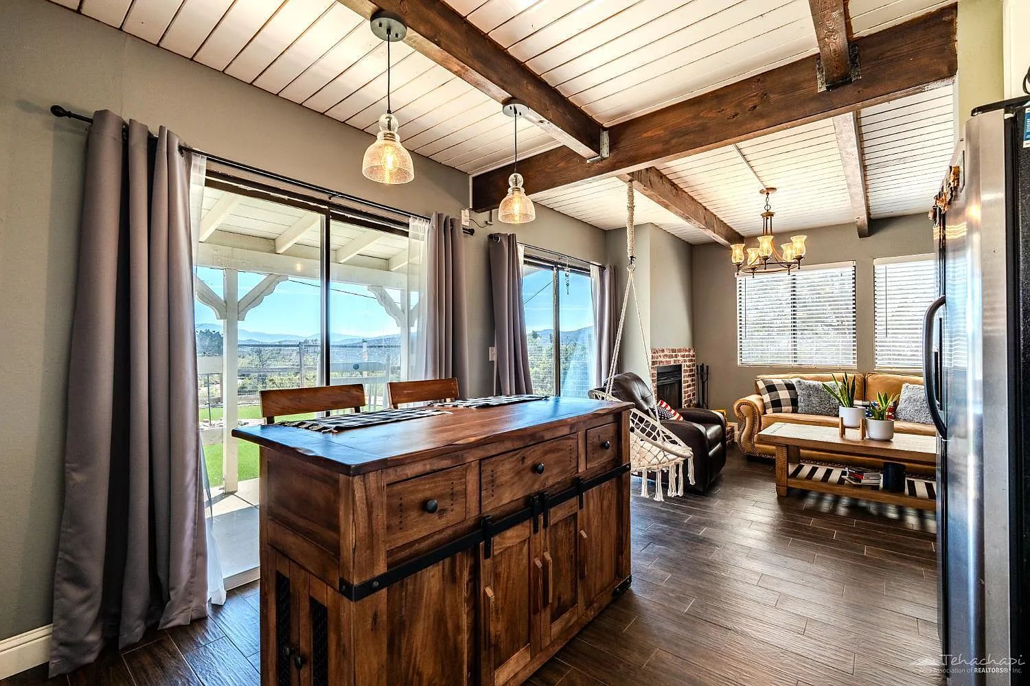 π» Open cathedral ceilings in living room with kitchen and bar area