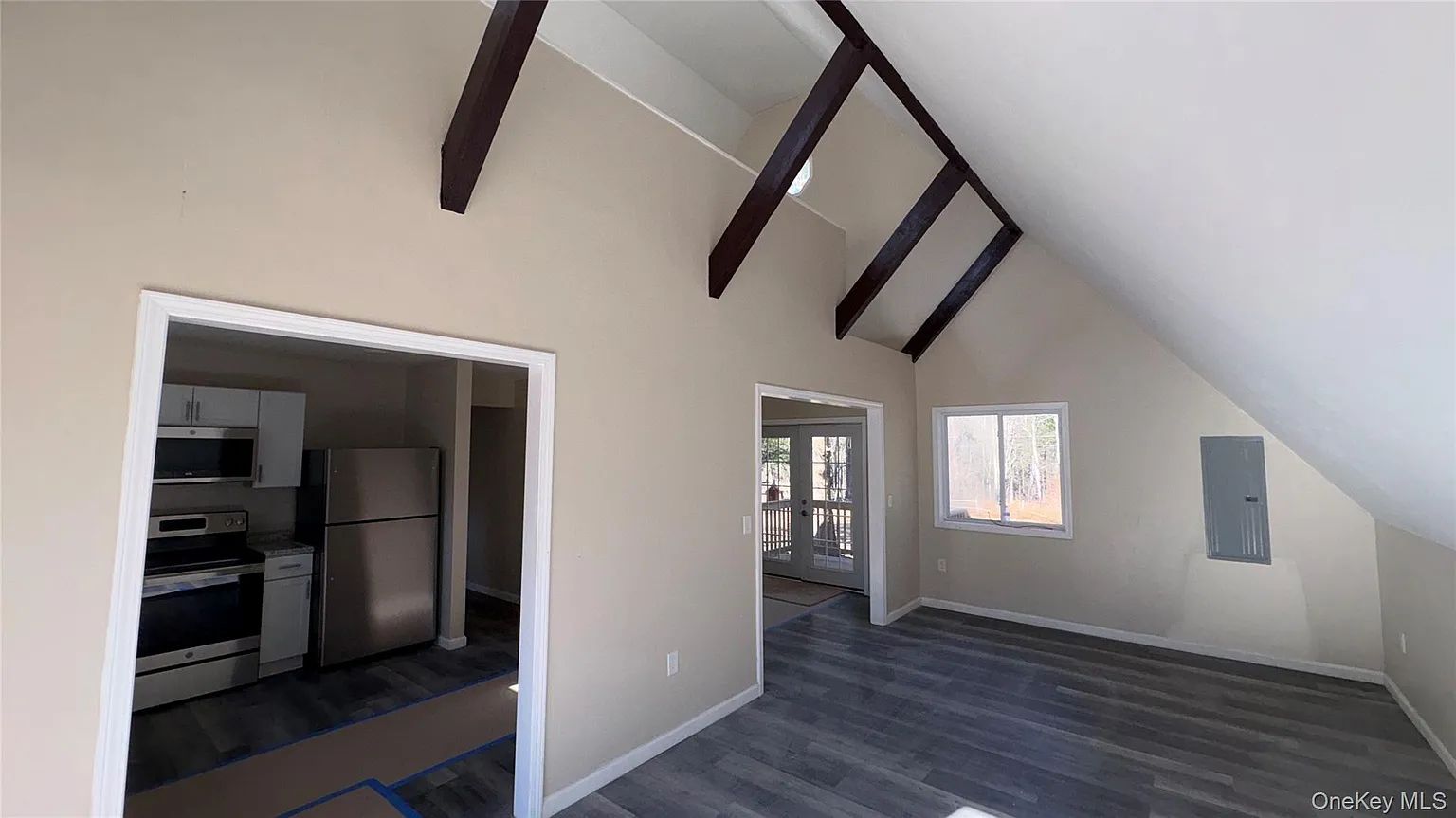 🪵 Vaulted ceilings with wooden beams and stylish stainless kitchen
